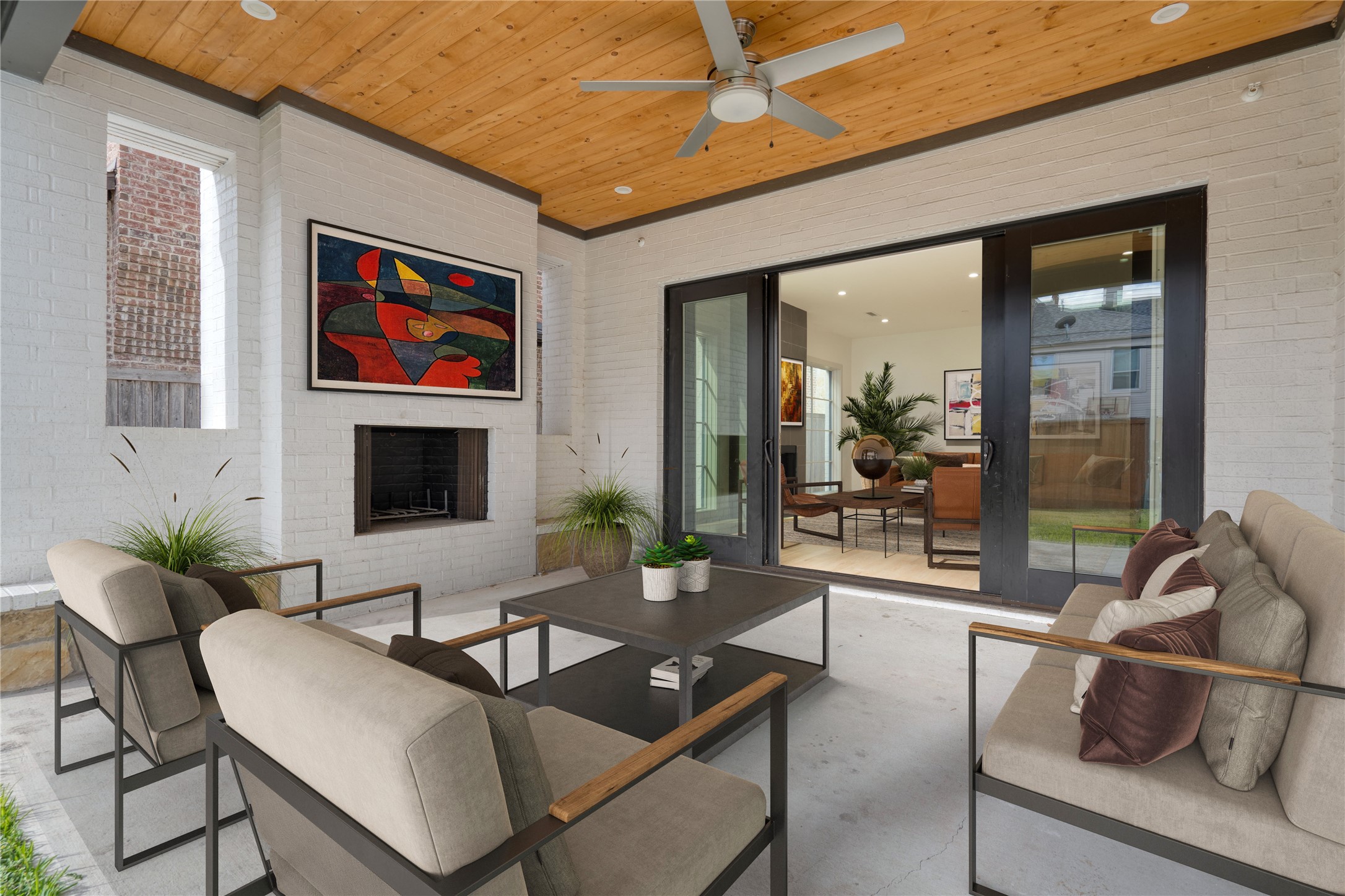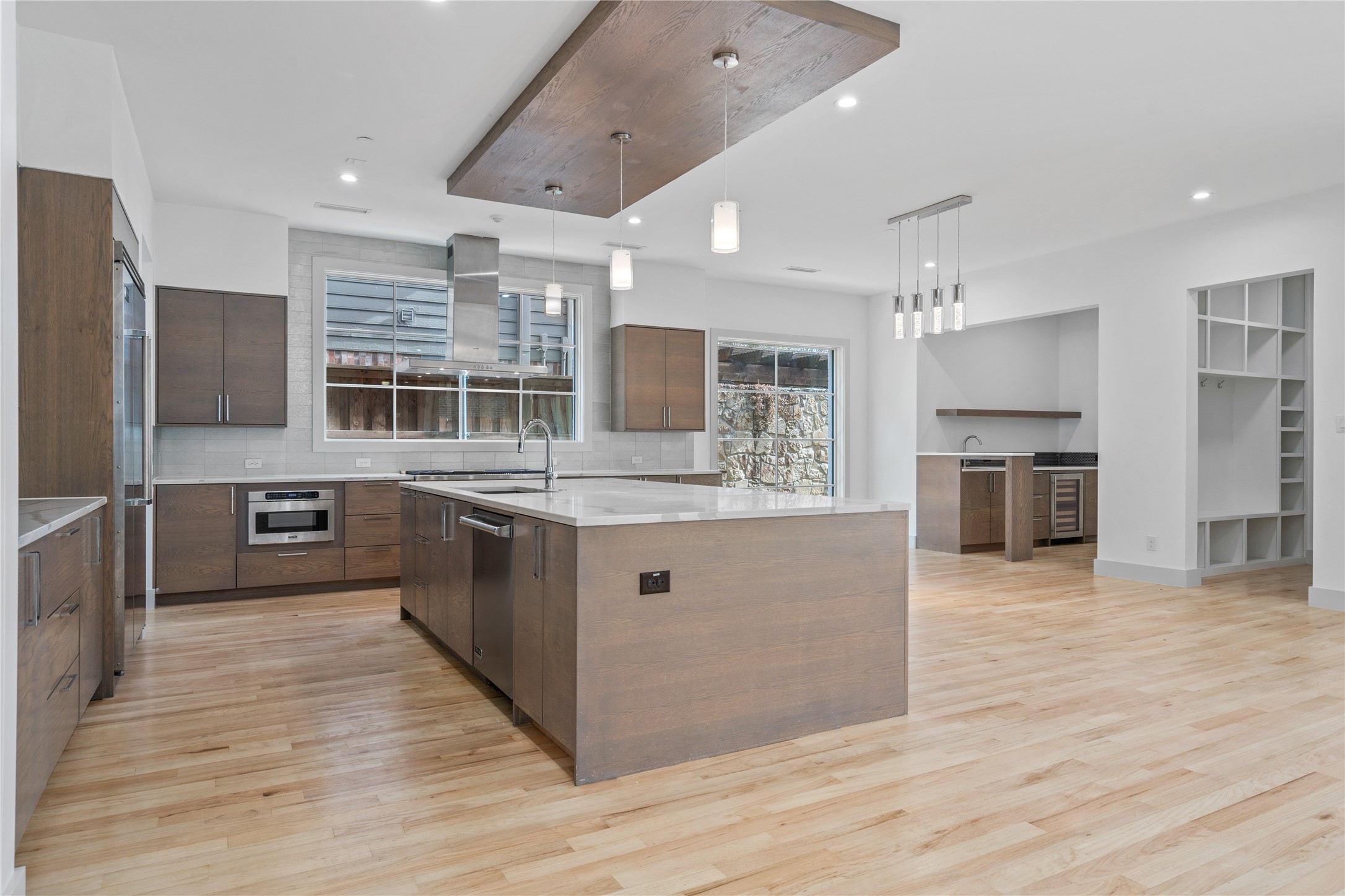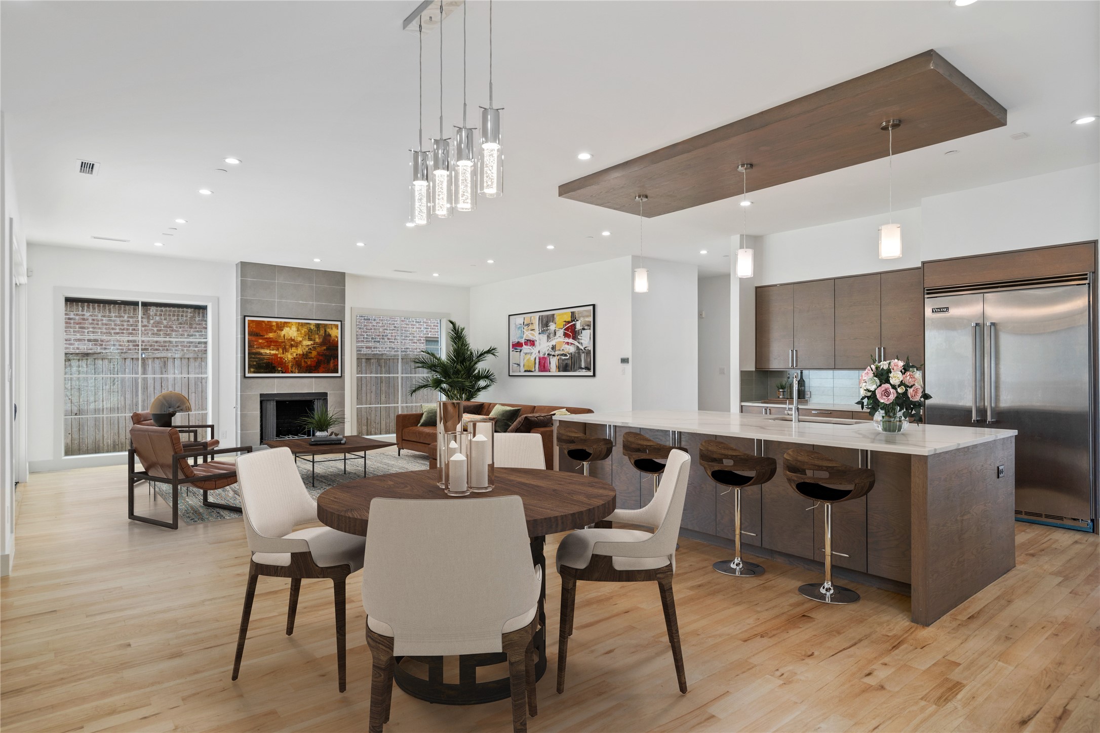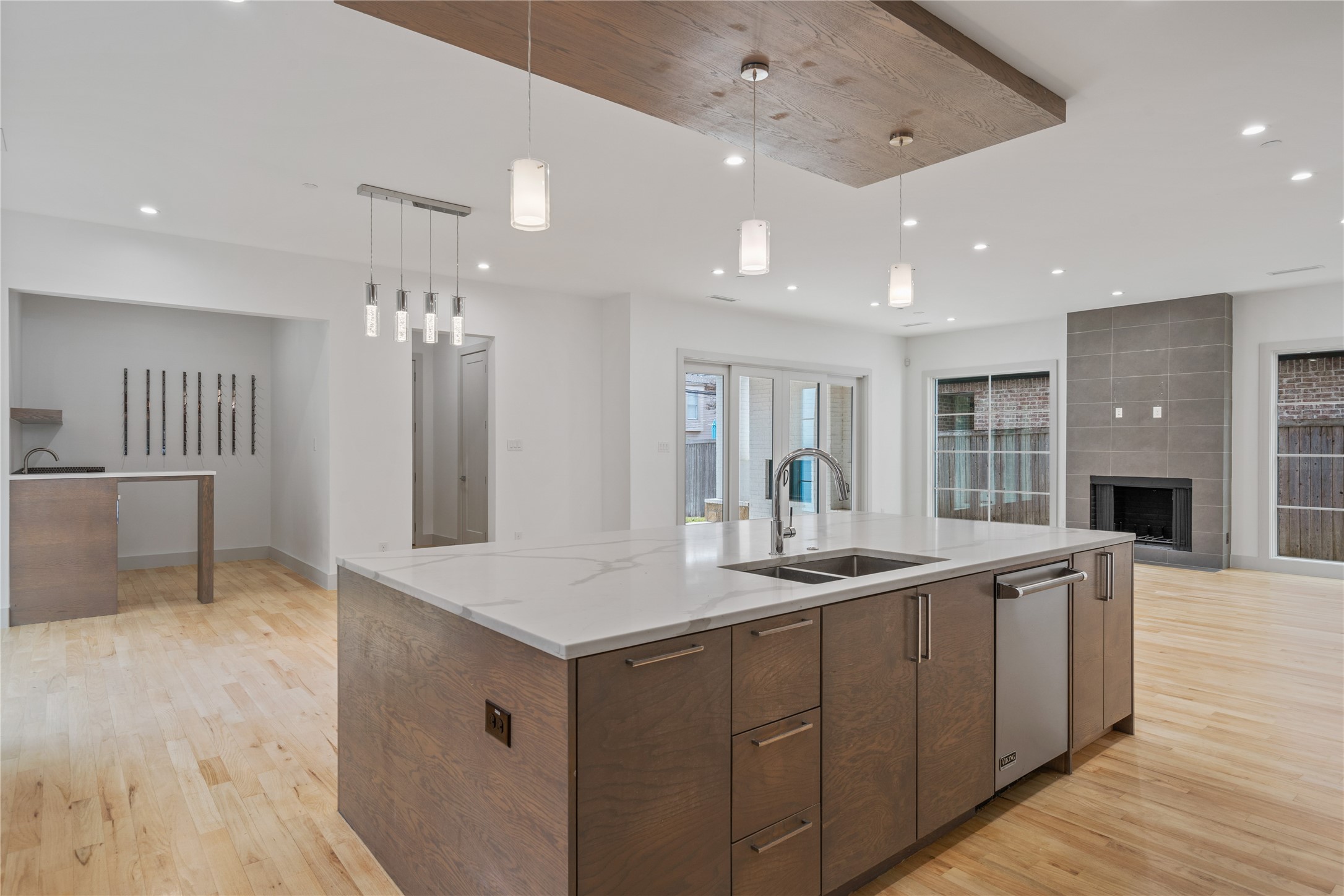 Step inside to discover a seamless layout tailor-made for both relaxation and entertainment. The huge kitchen is a chef's dream, featuring an expansive single-slab island, state-of-the-art Sub-Zero fridge, and a convenient wet bar and serving area. The great room, bathed in natural light from sleek slider doors, opens to a patio complete with a fireplace--perfect for gatherings and cozy evenings.