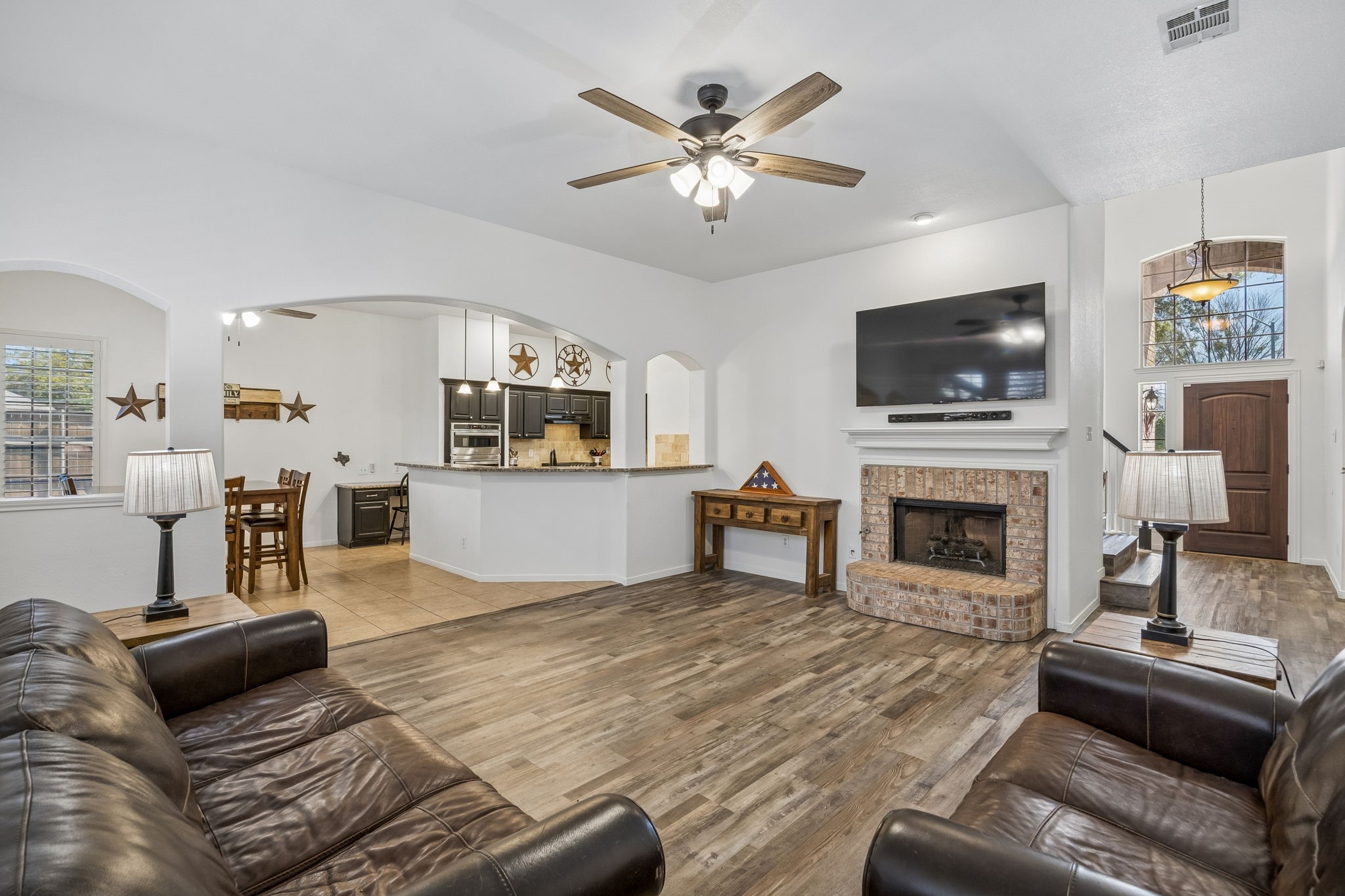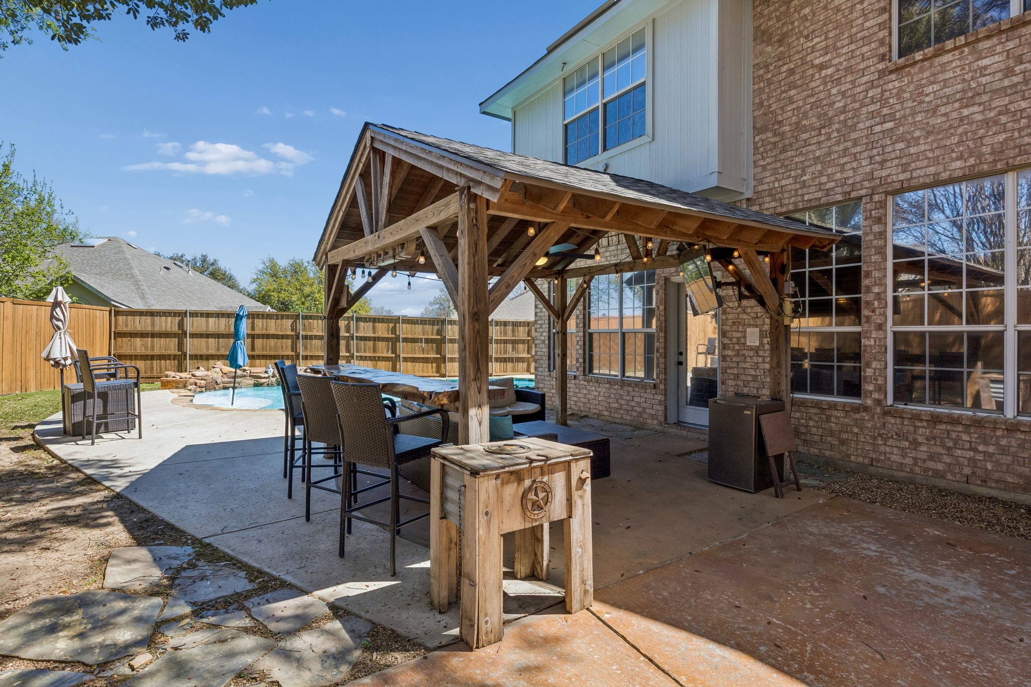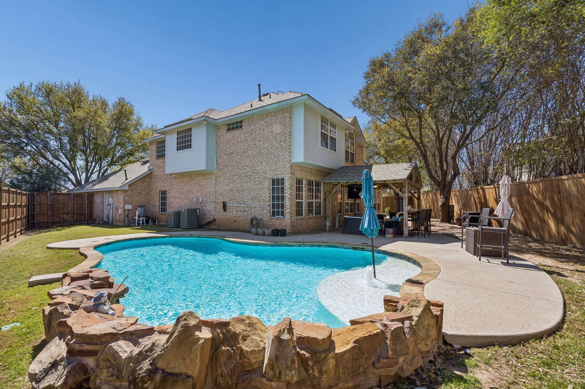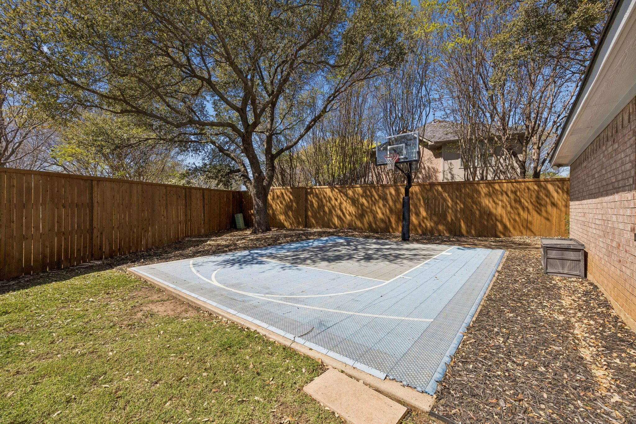 Your own private resort awaits! Dive into endless fun and relaxation with a sparkling pool featuring cascading waterfalls, a versatile sports court, and both covered and open patios perfect for entertaining or unwinding. With 4 bedrooms--3 upstairs and 1+ office downstairs--this home offers the ideal layout for convenience and comfort. Recent updates, including a new roof, microwave, oven, dishwasher, gorgeous wood flooring in most areas, a water heater, and serviced garage doors with a new spring, mean you can move in with peace of mind. Get ready to create lasting memories in this exceptional retreat! 5 Cimarron Court is located in the gateway to Trophy Club with easy access to Highway 114 taking you to Dallas or Fort Worth. A local shopping center provide the essentials and an array of dining and shopping options are very close. ***buyer will need new survey