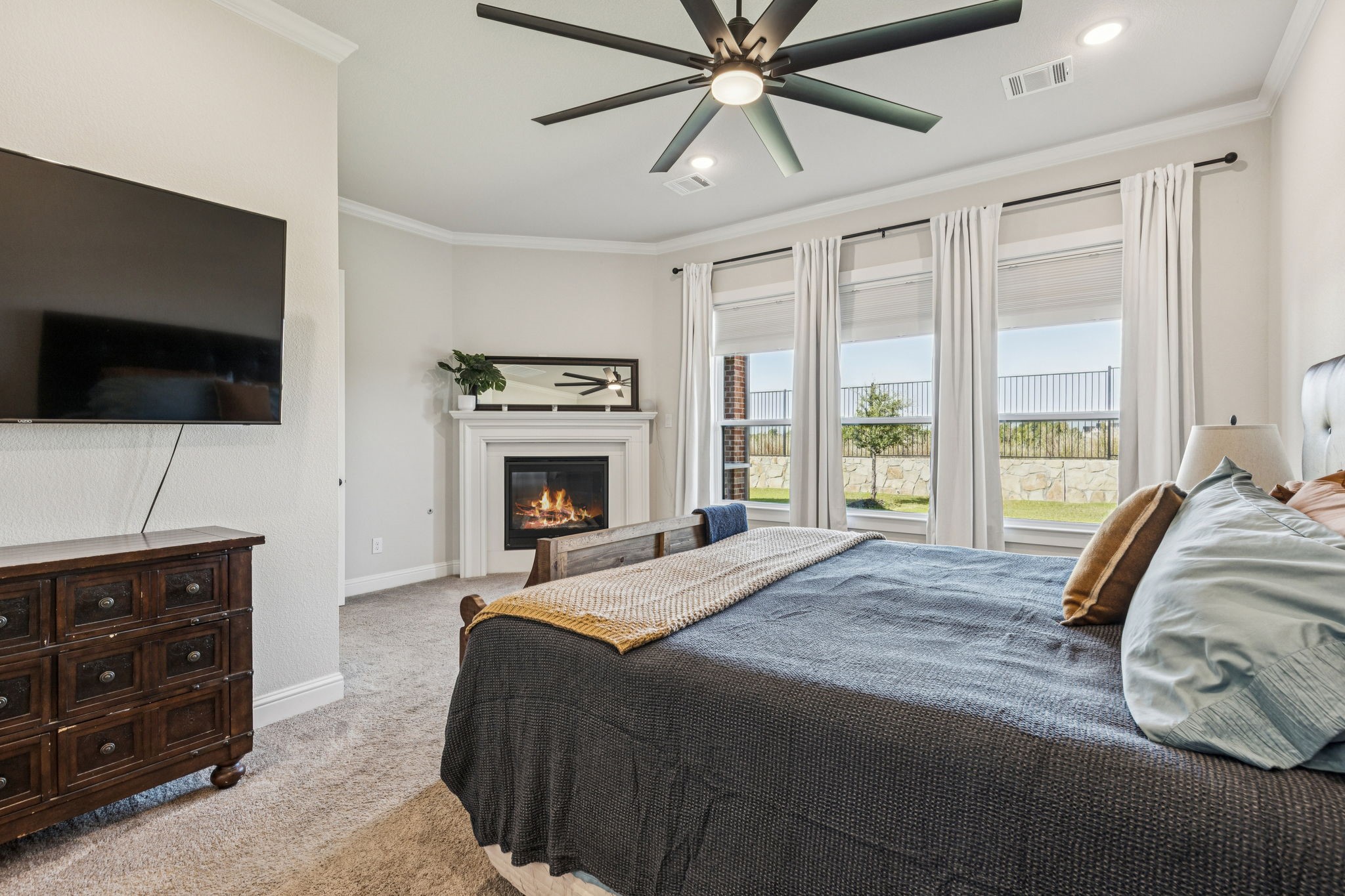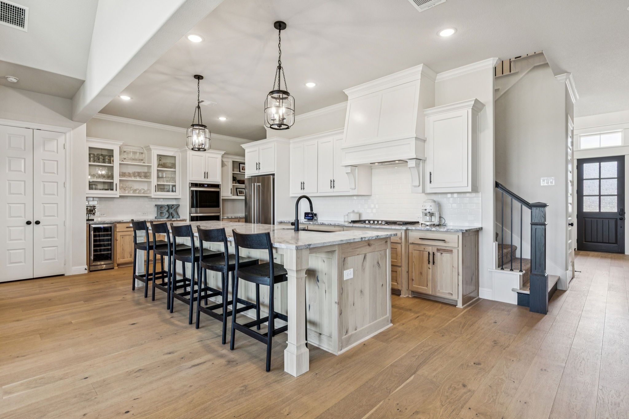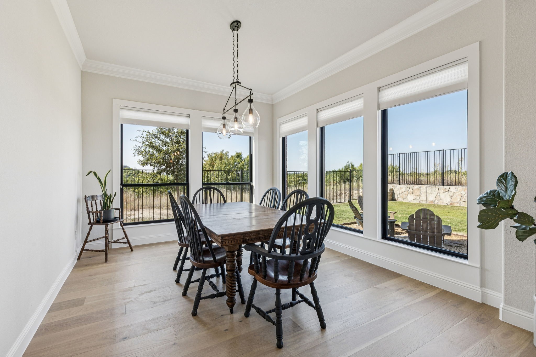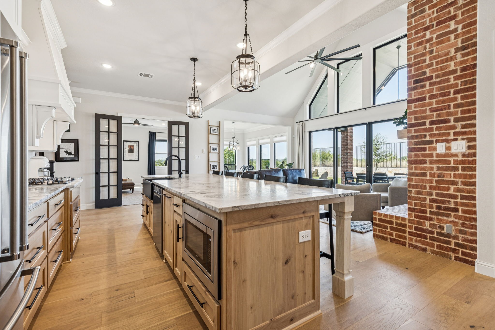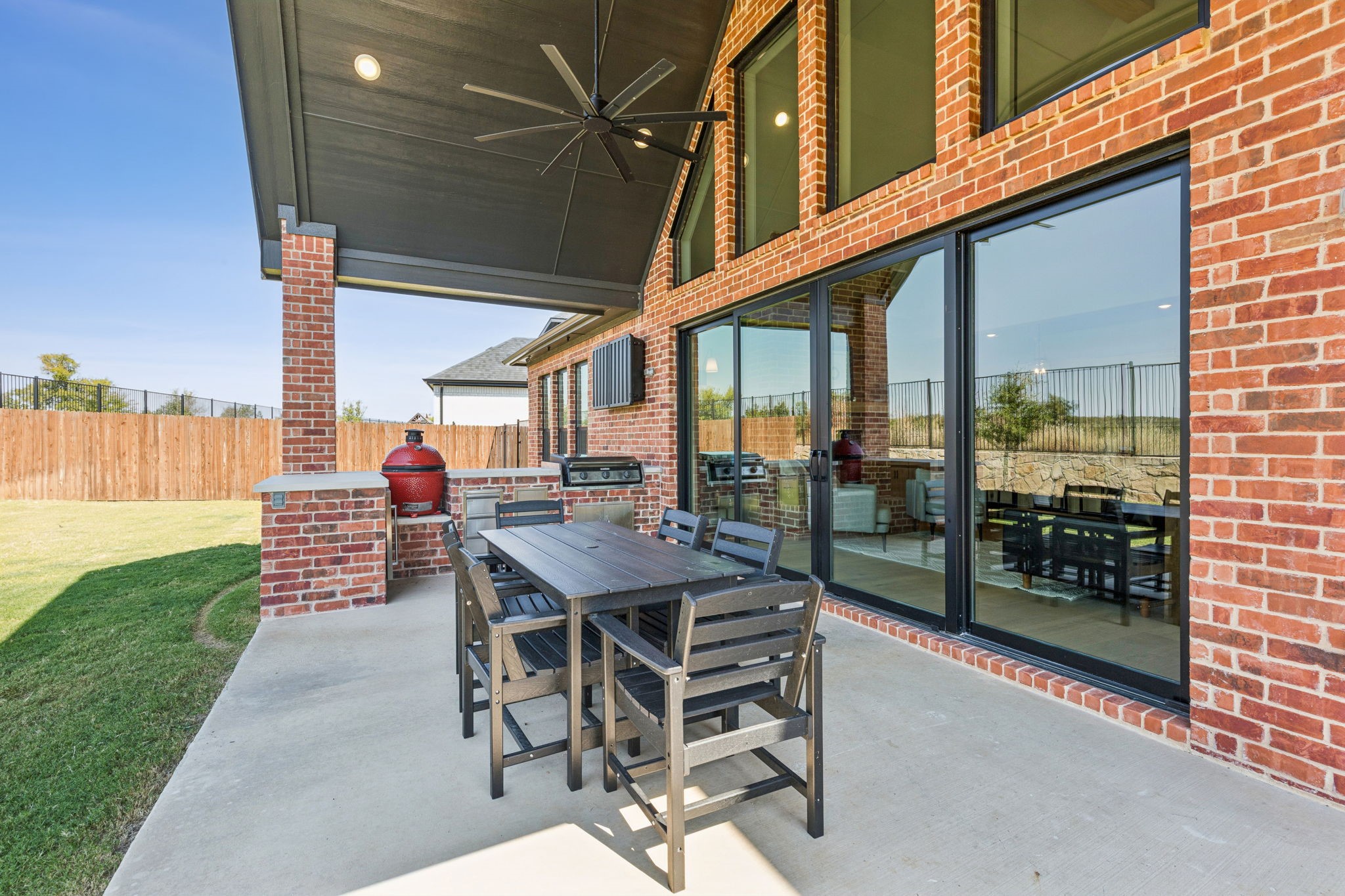 ONE-OF-A-KIND custom home, sprawling views of the Aledo countryside. Located in the highly sought-after Aledo ISD, this 5 Bedroom, 4 bath home is a unique opportunity to own a piece of serenity. The home features a custom floor plan designed to maximize the views of its 80-foot wide corner lot located on the Bluff above the popular Parks of Aledo trail system. Walk out your front or back door and jump on the 13+ miles of hiking & biking trails. Relax with your coffee or wine and enjoy the views on your wrap-around front porch or expanded back patio with a built-in outdoor kitchen. Entertainer's dream- with 3 living spaces, an eat-in gourmet kitchen complete with a 12-foot island, double-oven, and warming drawer. Relax in the primary bedroom suite with a fireplace, spa-like bathroom with an extra-large shower, and extended pass-through closet to a huge laundry room. Downstairs highlights are a study (bedroom) with full bath, media room with a 7.1 surround sound, formal living area with fireplace, and primary suite with a fireplace. There is plenty of closet space for storage, including a dedicated safe closet. Upstairs includes three bedrooms and two bathrooms, complete with a flex space for a game room. Finally, the home boasts an extra-large 800 sq. ft. 3-car garage with added space for a workshop, gym, or indoor driving range. This home has all the features a family needs or wants, so schedule a time to come see it today! In the community: sports complexes at the schools, a day care, a retirement home, grocery, drug store, quick dining and more.